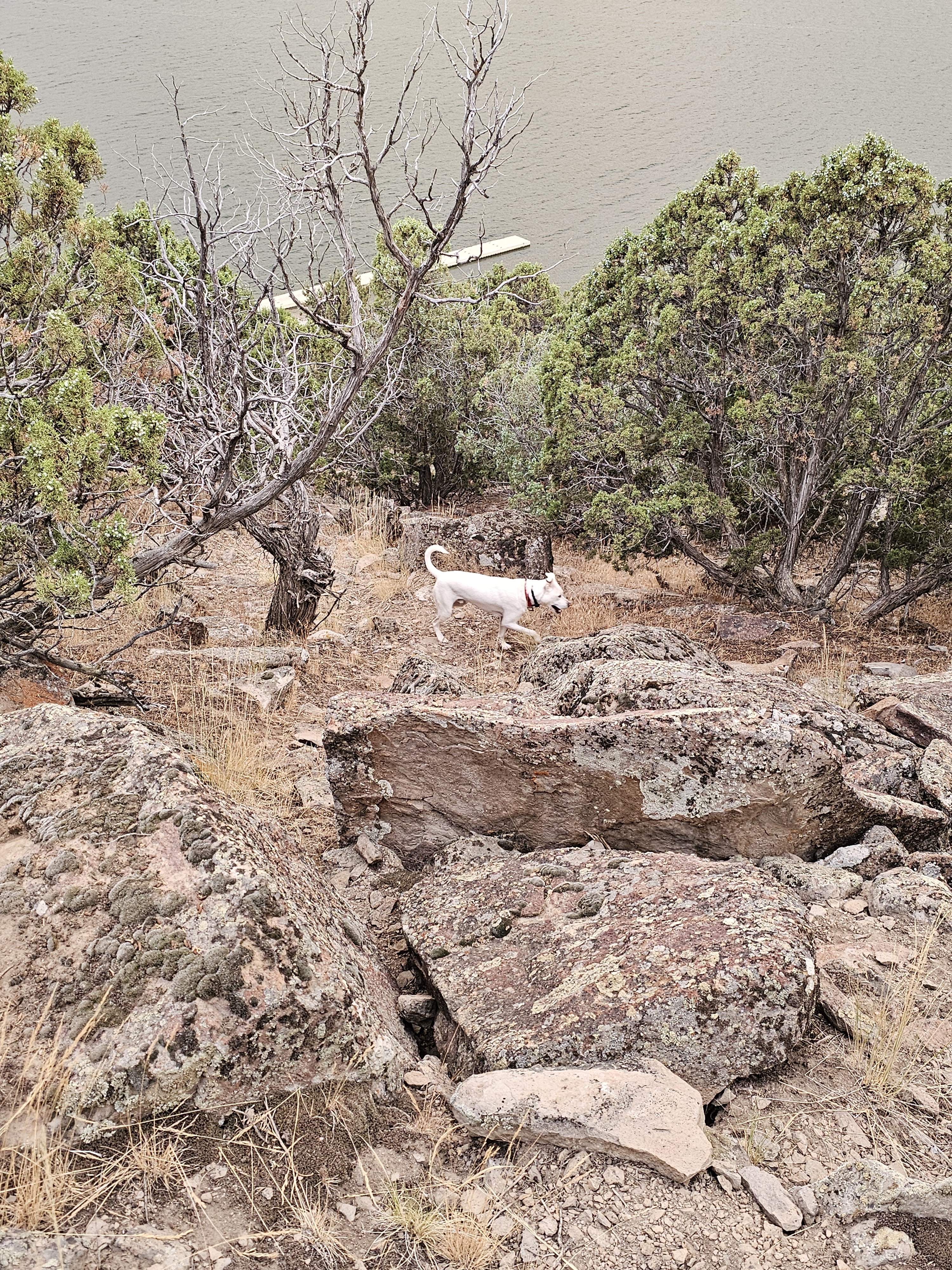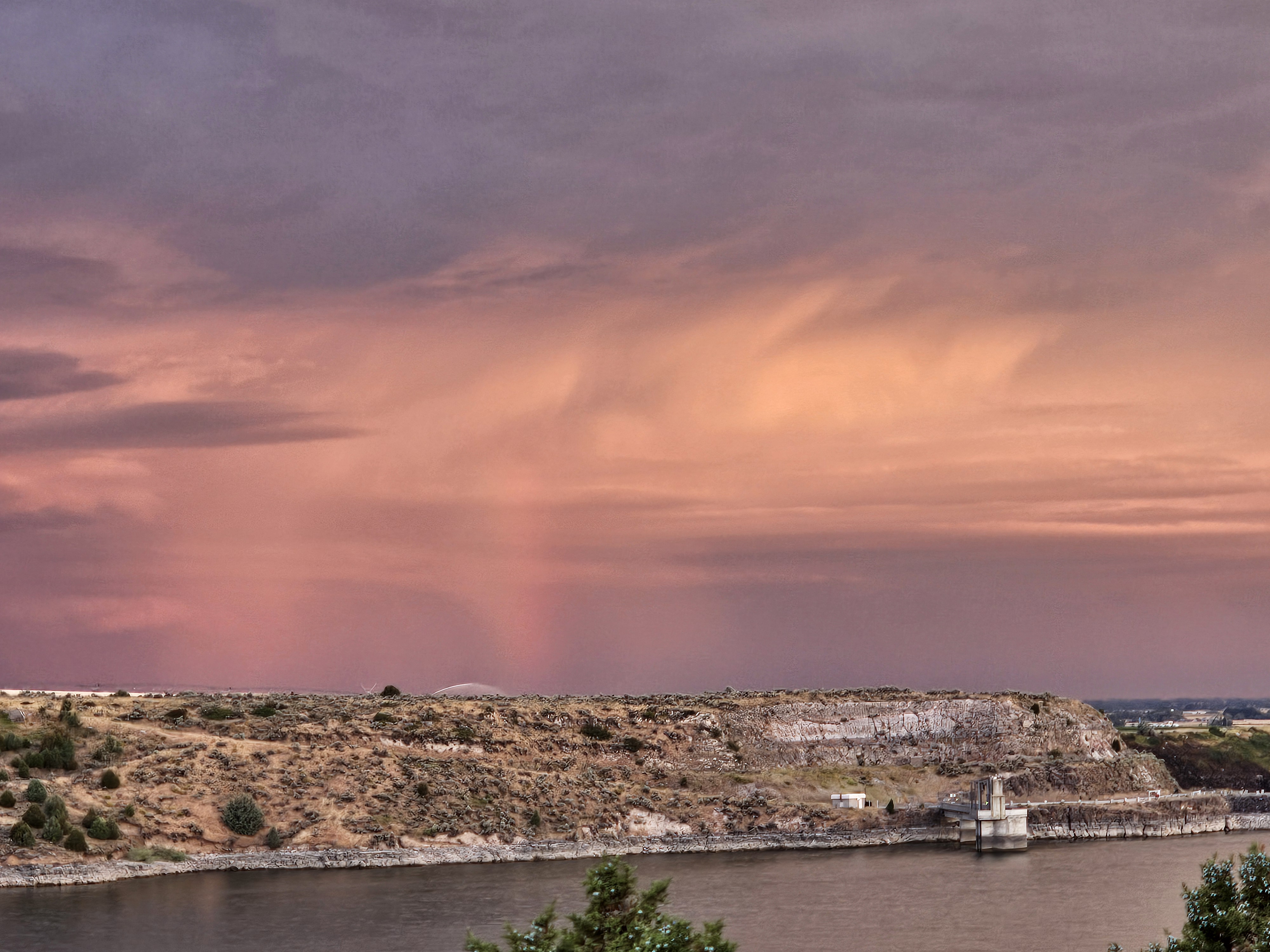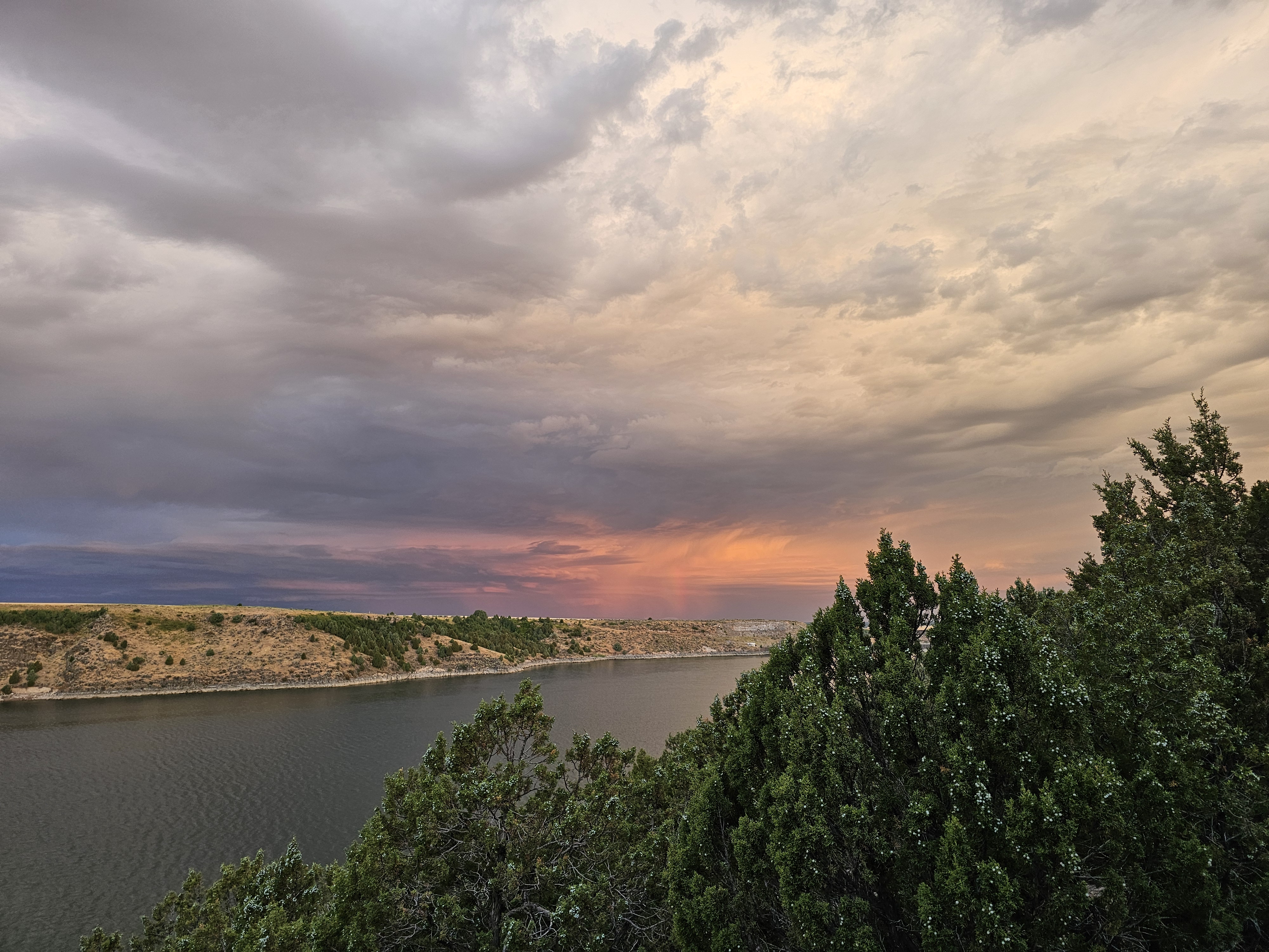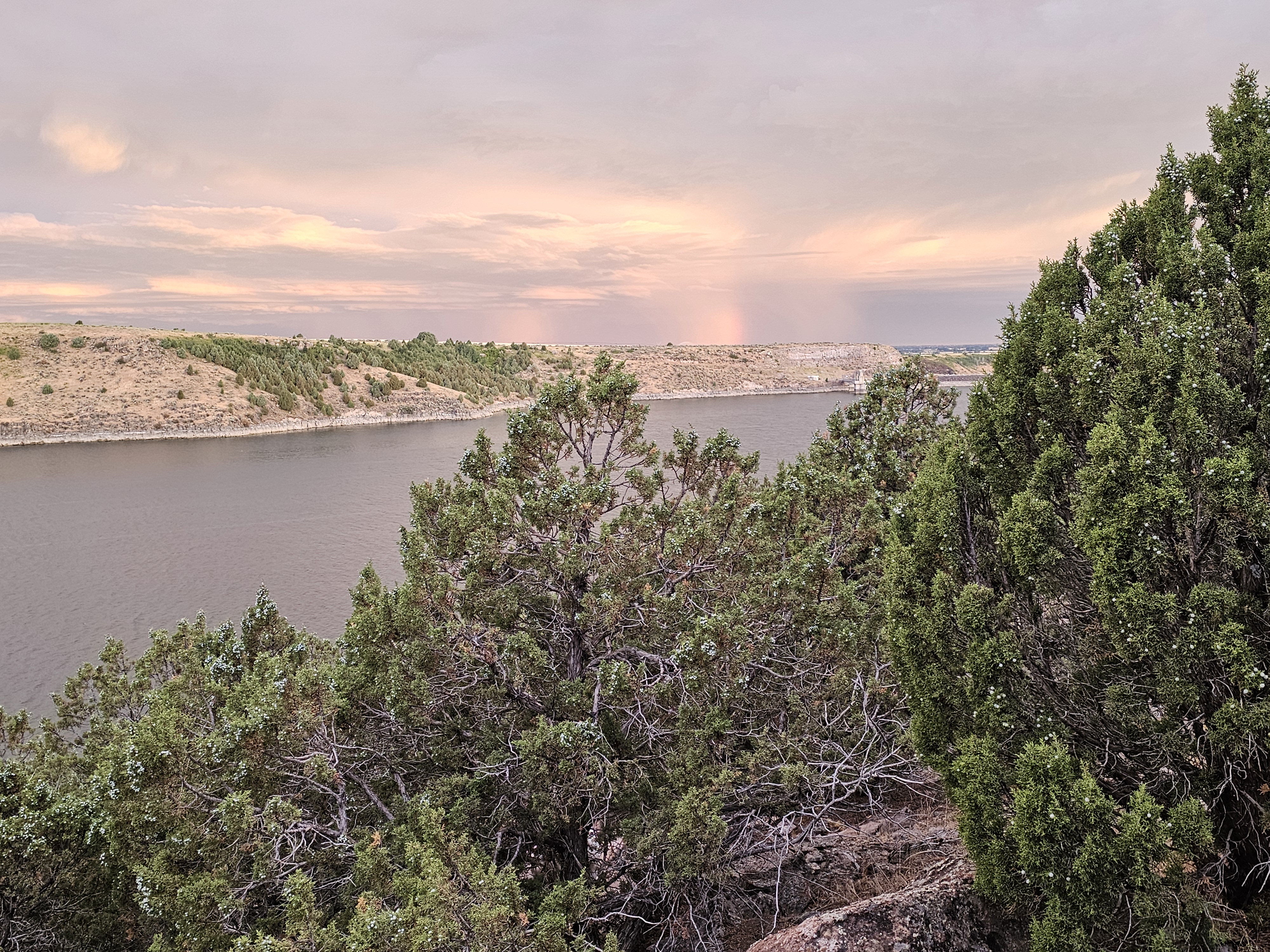 While Aaron was gone, the dog and I took short walks exploring the cliff overlooking the river. It was good to get my ankle moving, and the pup needed to run and sniff and explore. The pup and I found an almost complete deer skeleton. The skull was missing. We saw a partial rainbow during a sunrise on a stormy morning. We really had some beautiful views!
