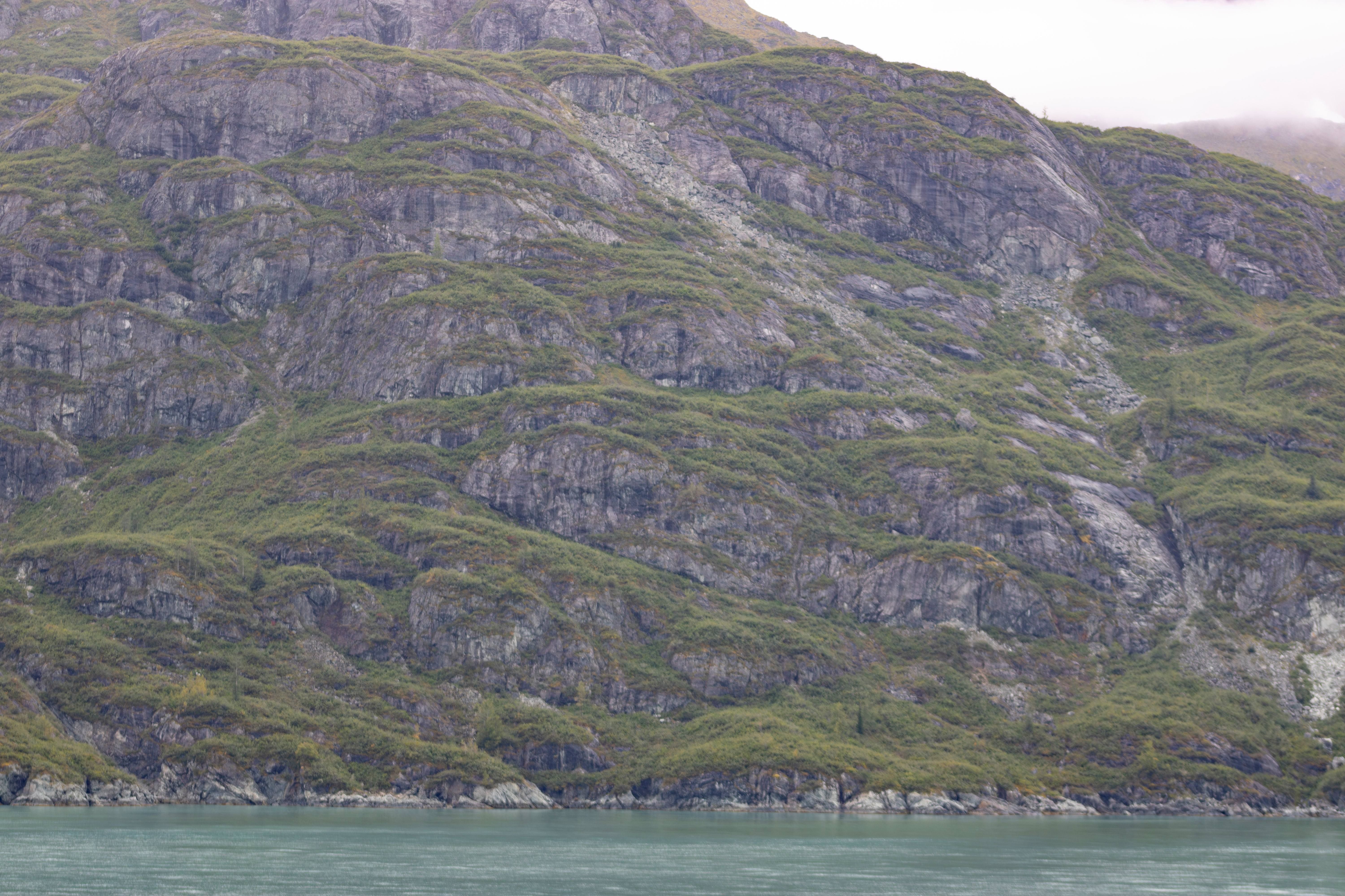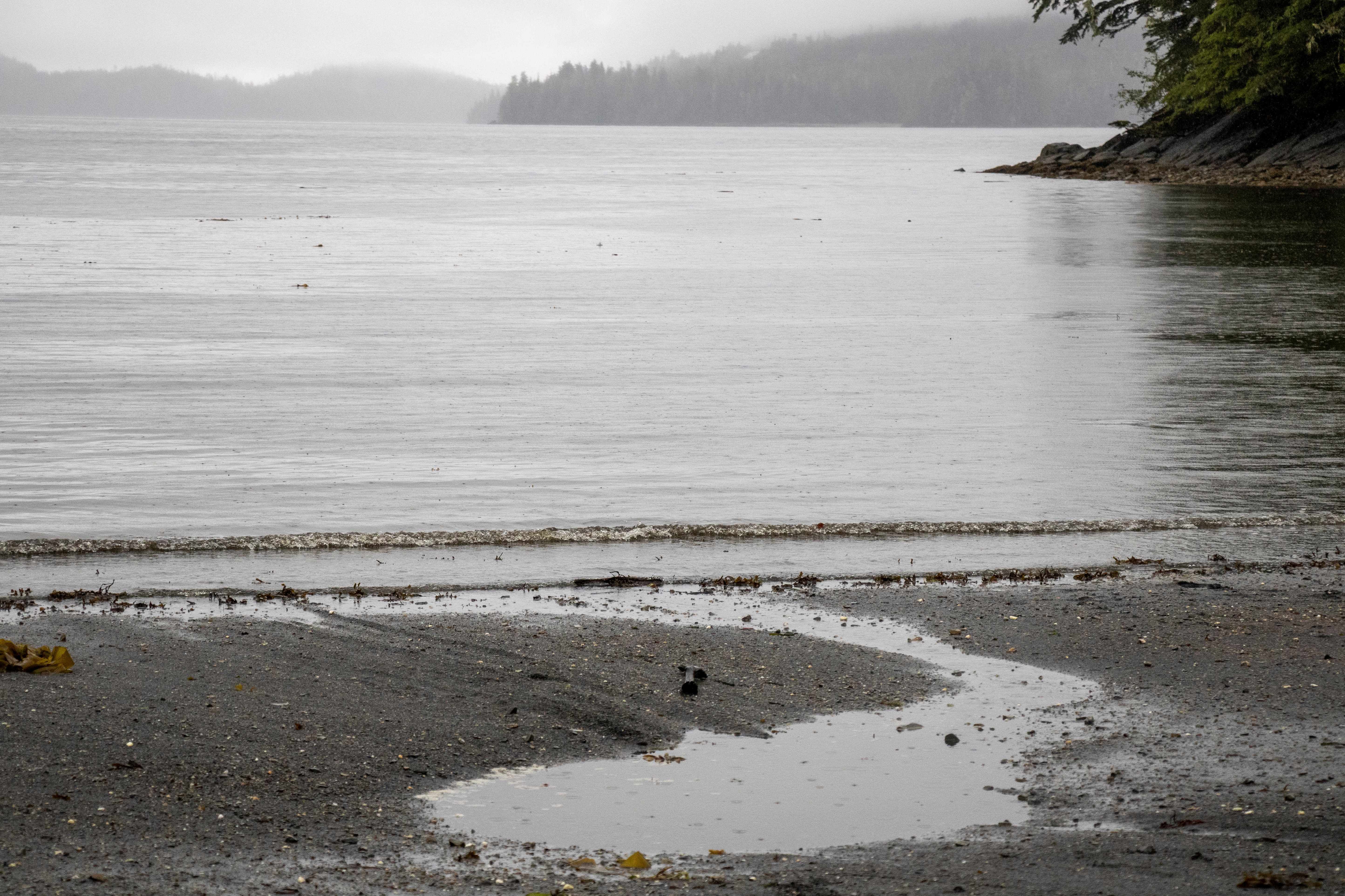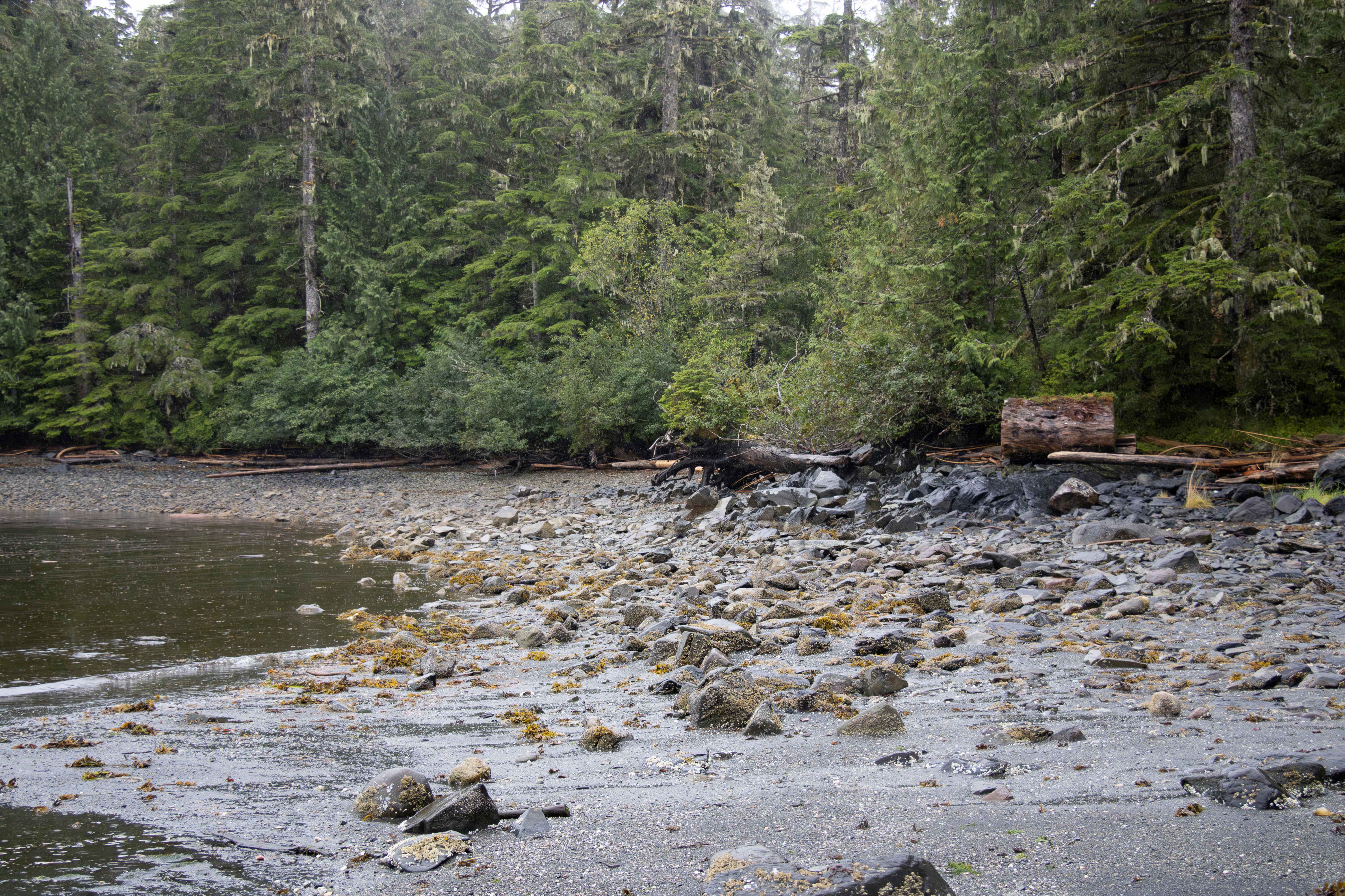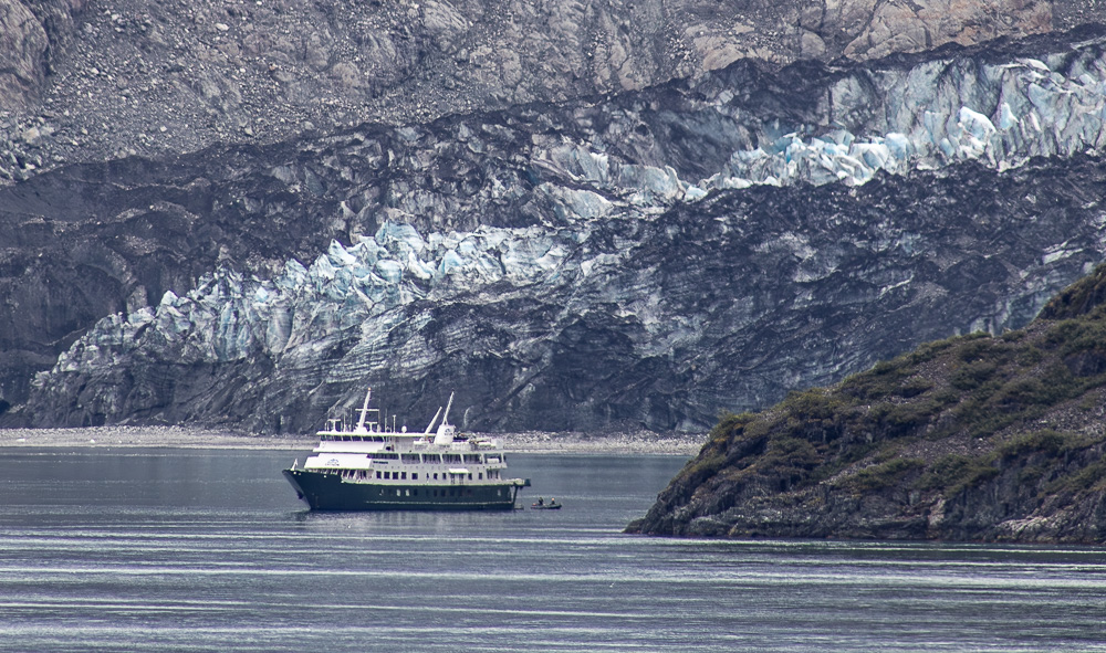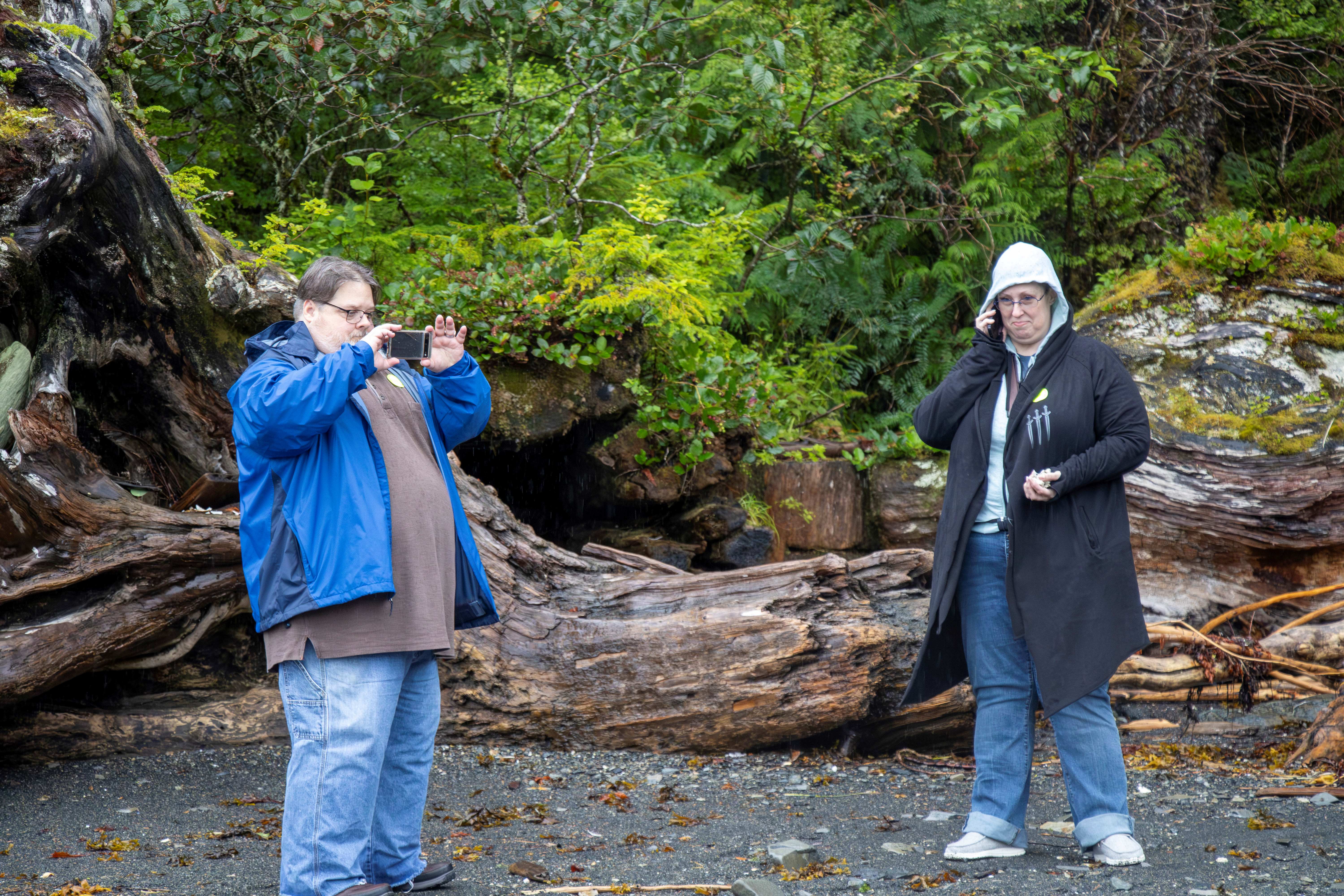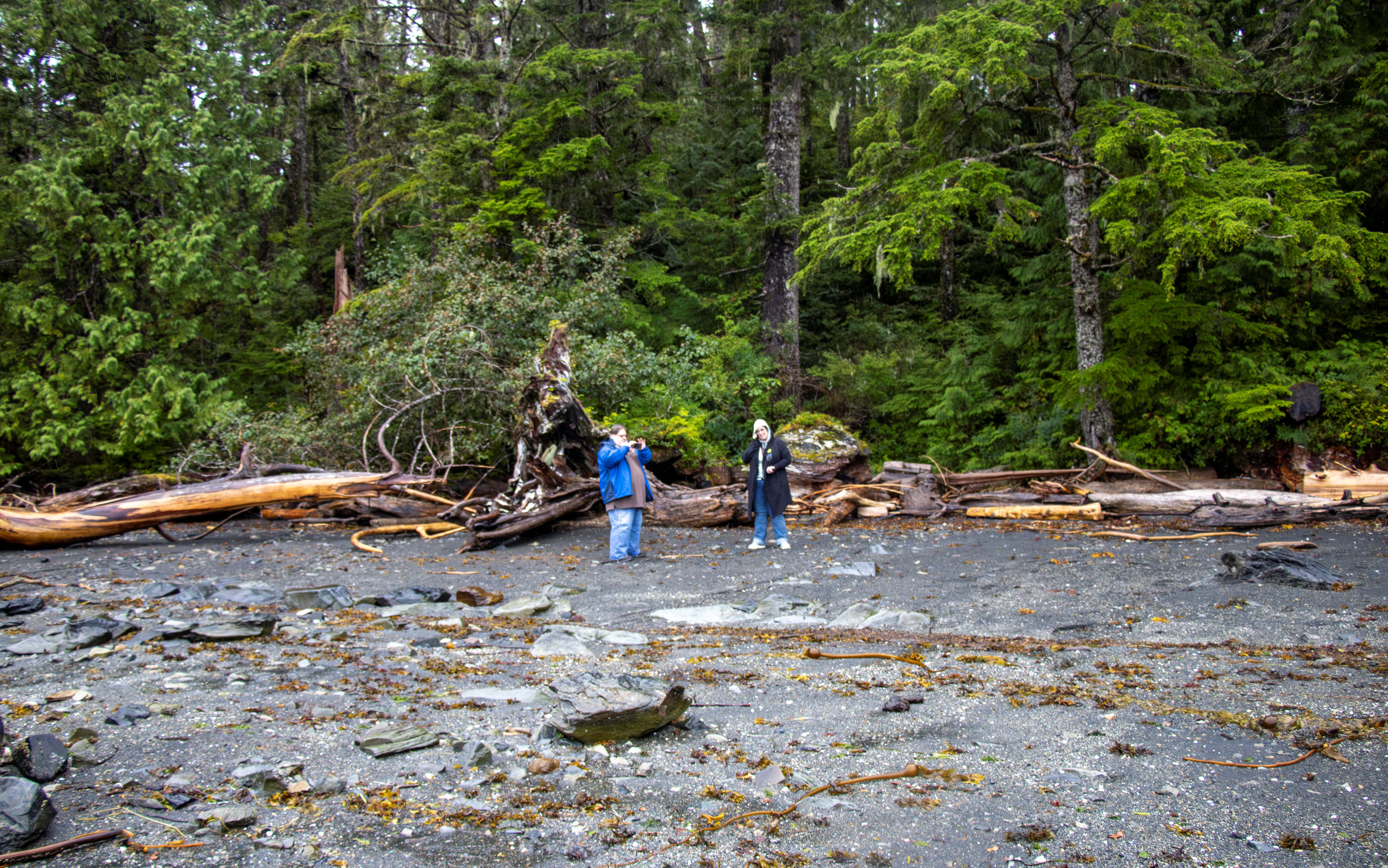 The cove we landed on had a black beach and then a forest. There was a nice trail leading a little way into the rain forest, but I took too long on the beach and only had about 5 minutes to walk on the trail. On the beach, there were bald eagle feathers. Fortunately, our guide warned us that it is illegal to collect eagle feathers. Each feather could be a fine of up to $5,000 and up to a year in jail. We really enjoyed the beauty of the cove.