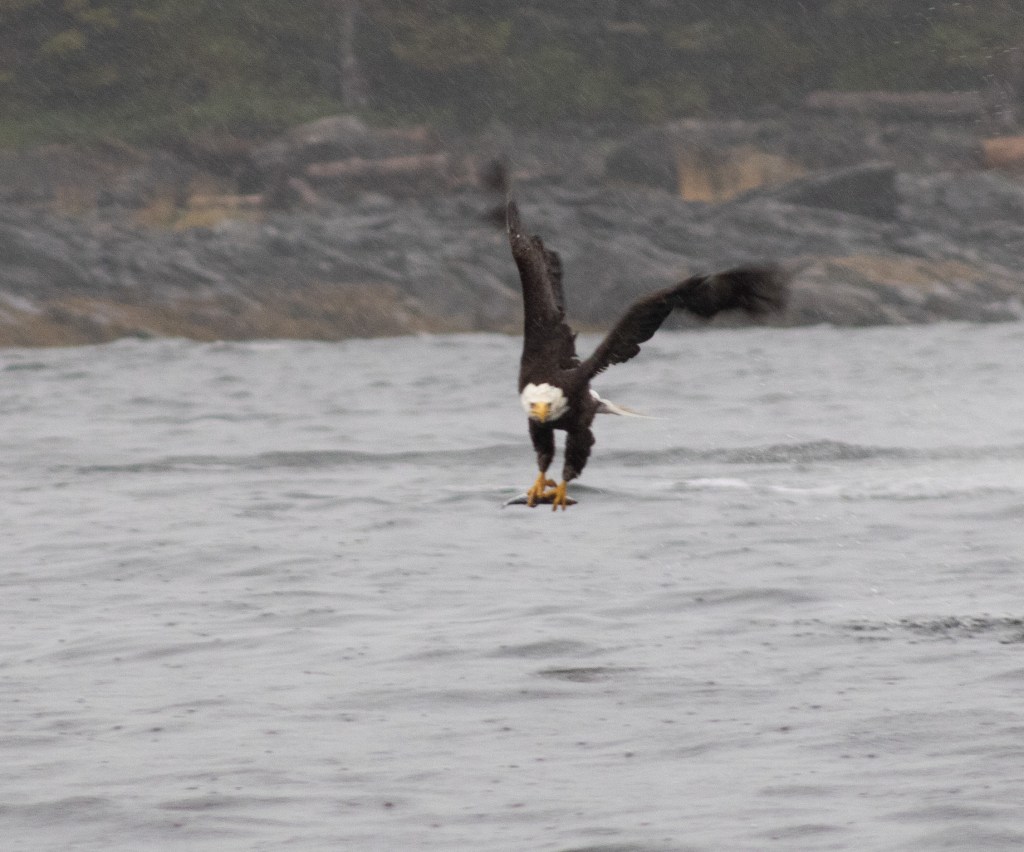 An eagle with a fish in its talons. It is a little blurry due to my excitement of being so close and having the opportunity to catch such a beautiful bird of prey in action.