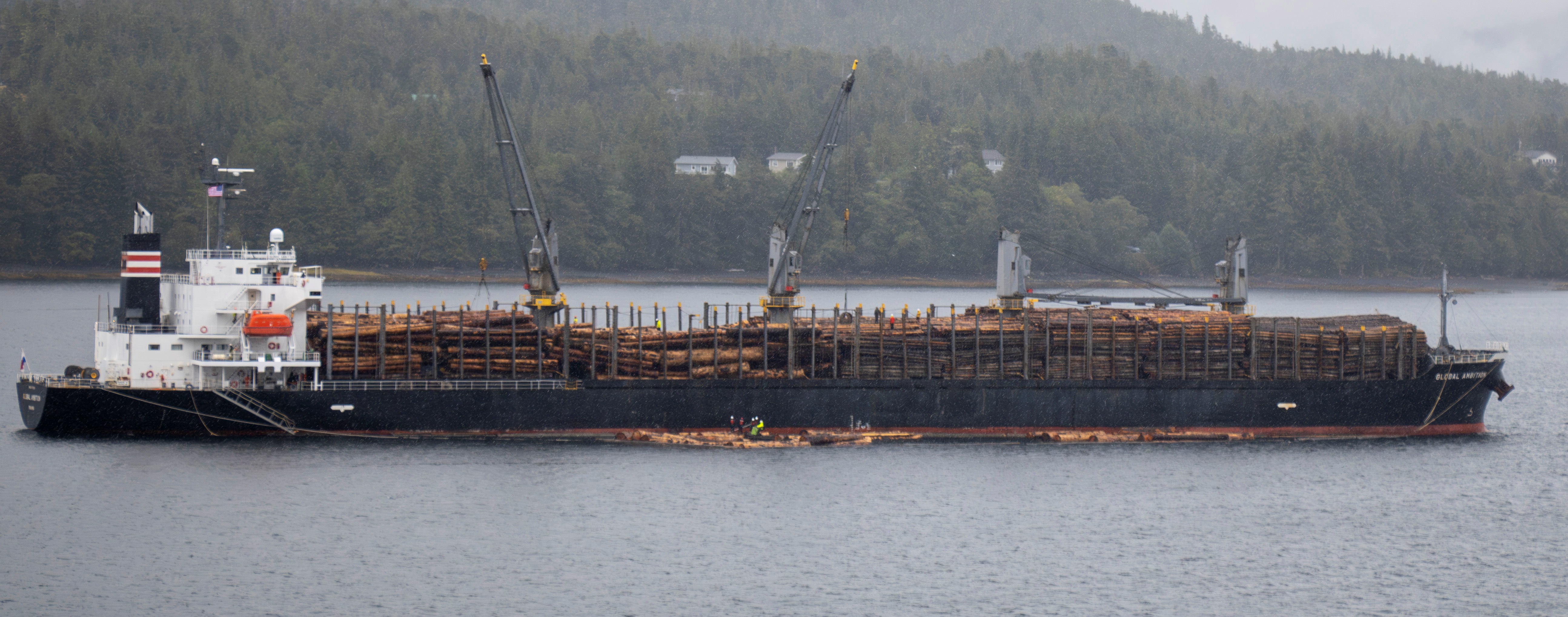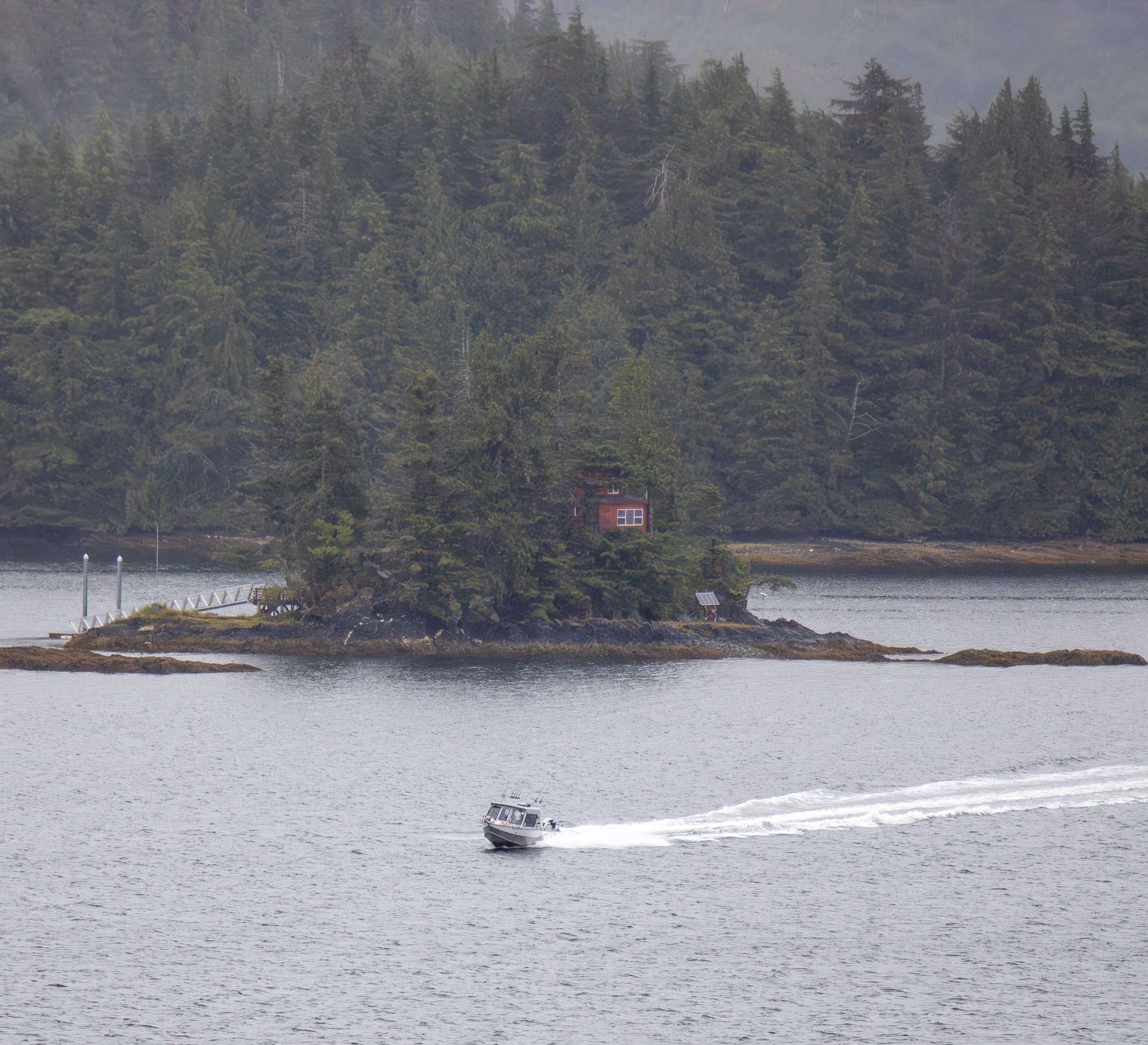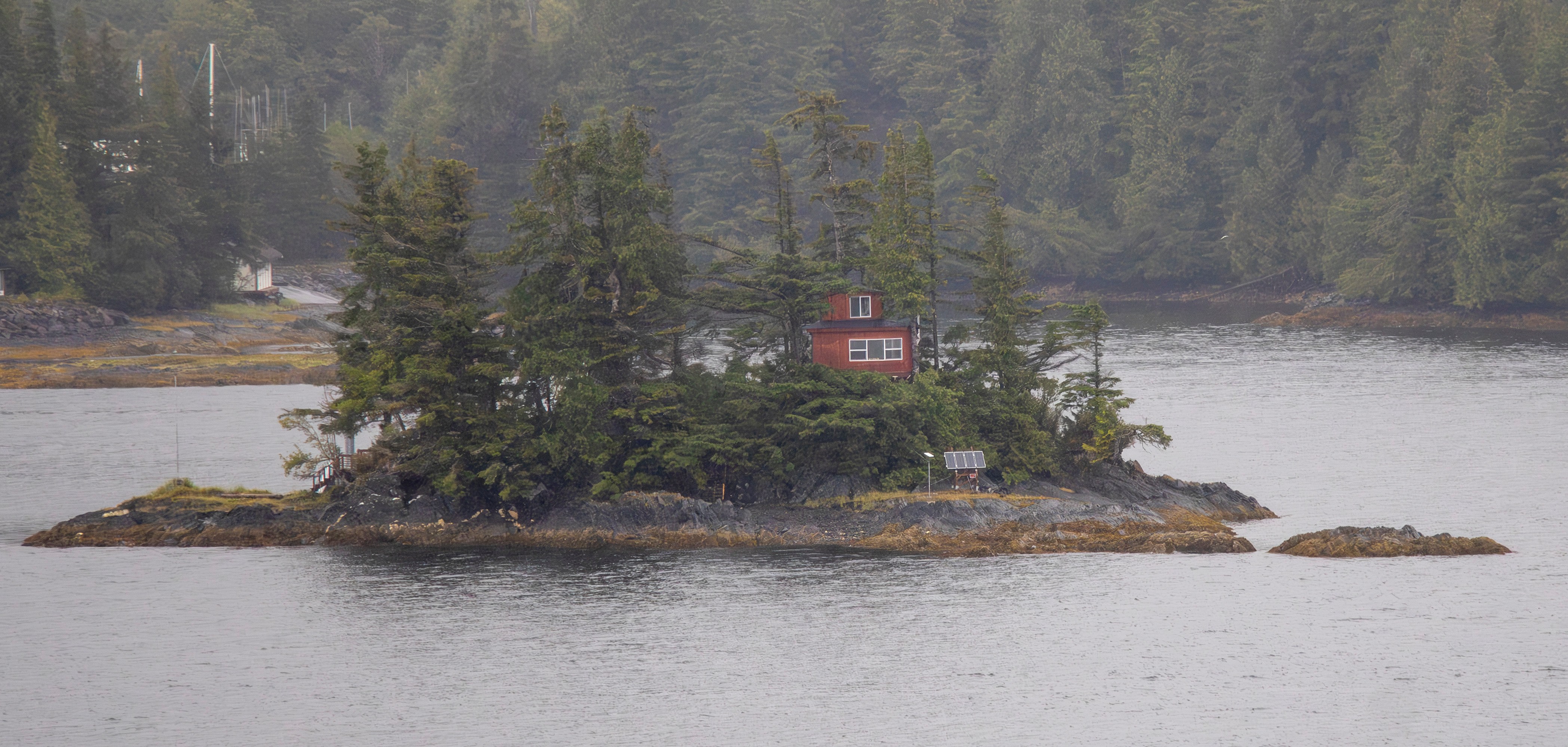 After the tour, it was time to head back to the cruise ship and depart Alaska. We enjoyed the sights of Ketchikan from our balcony on the way out. I found an alternative to our nomadic living. There are small islands with one home on each that would be perfect to settle in for the spring and summer. We also saw a huge logging vessel and a giant cross on the shore.