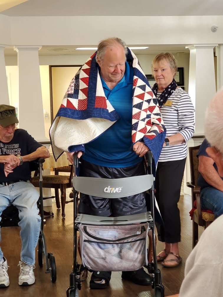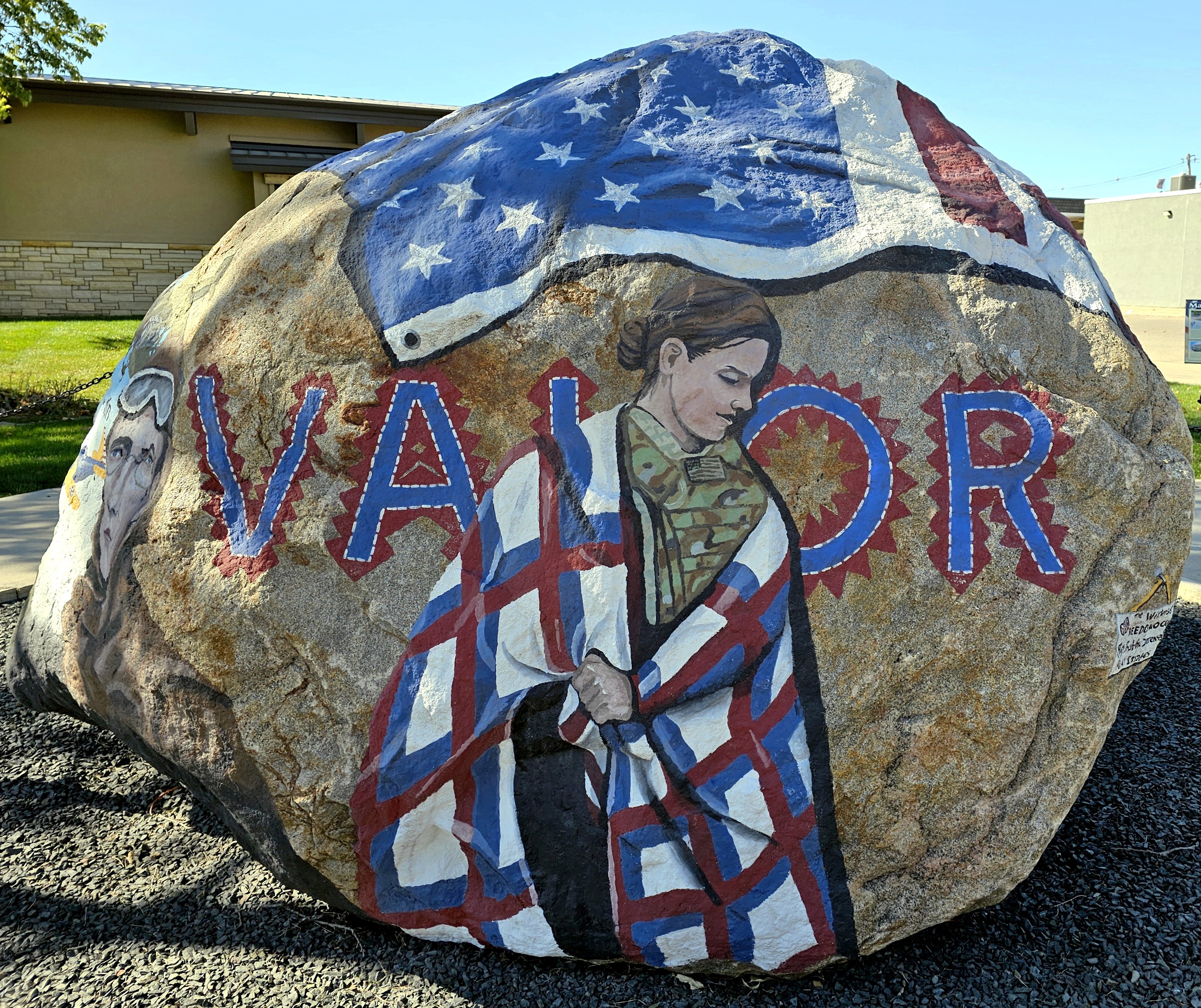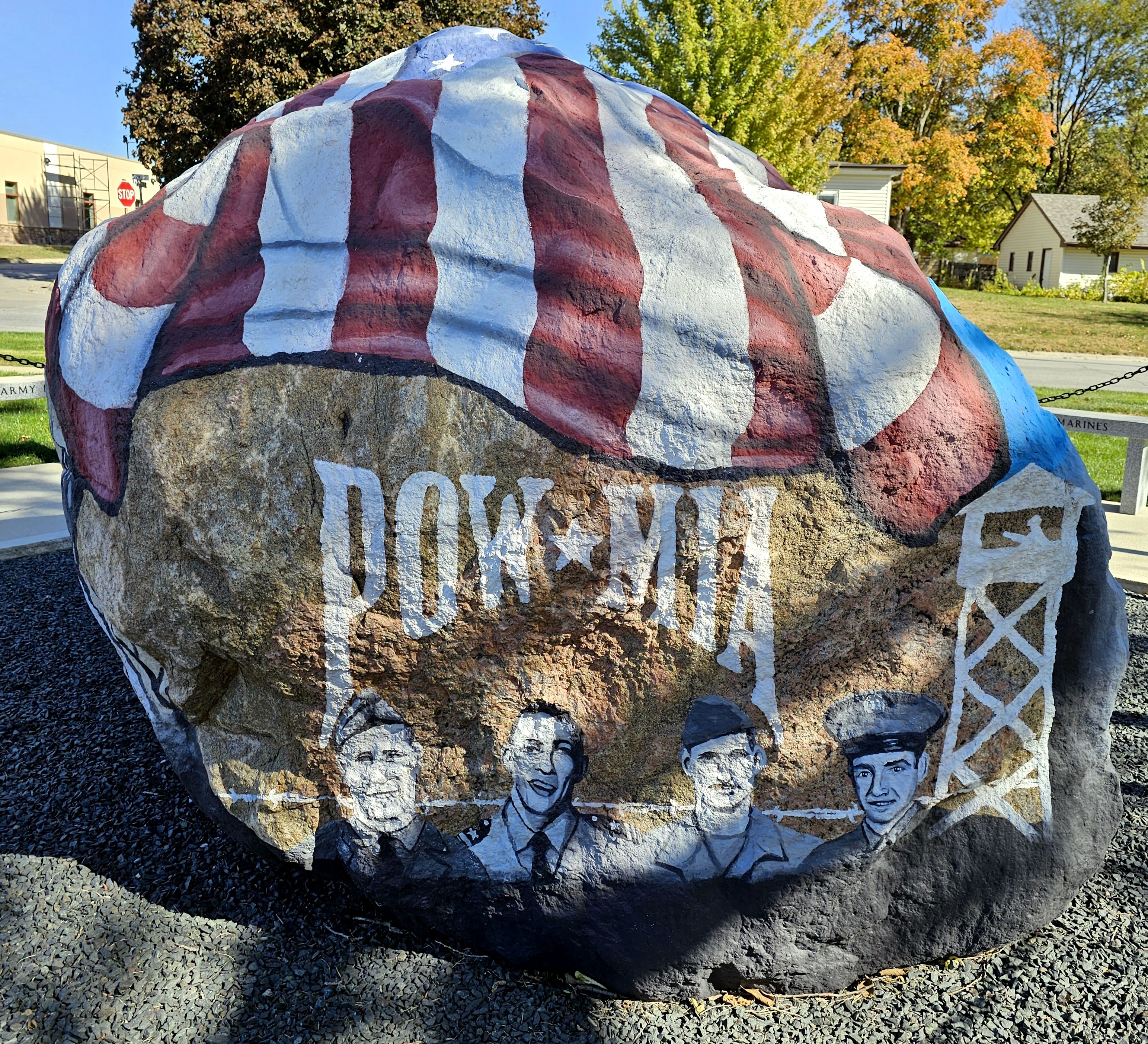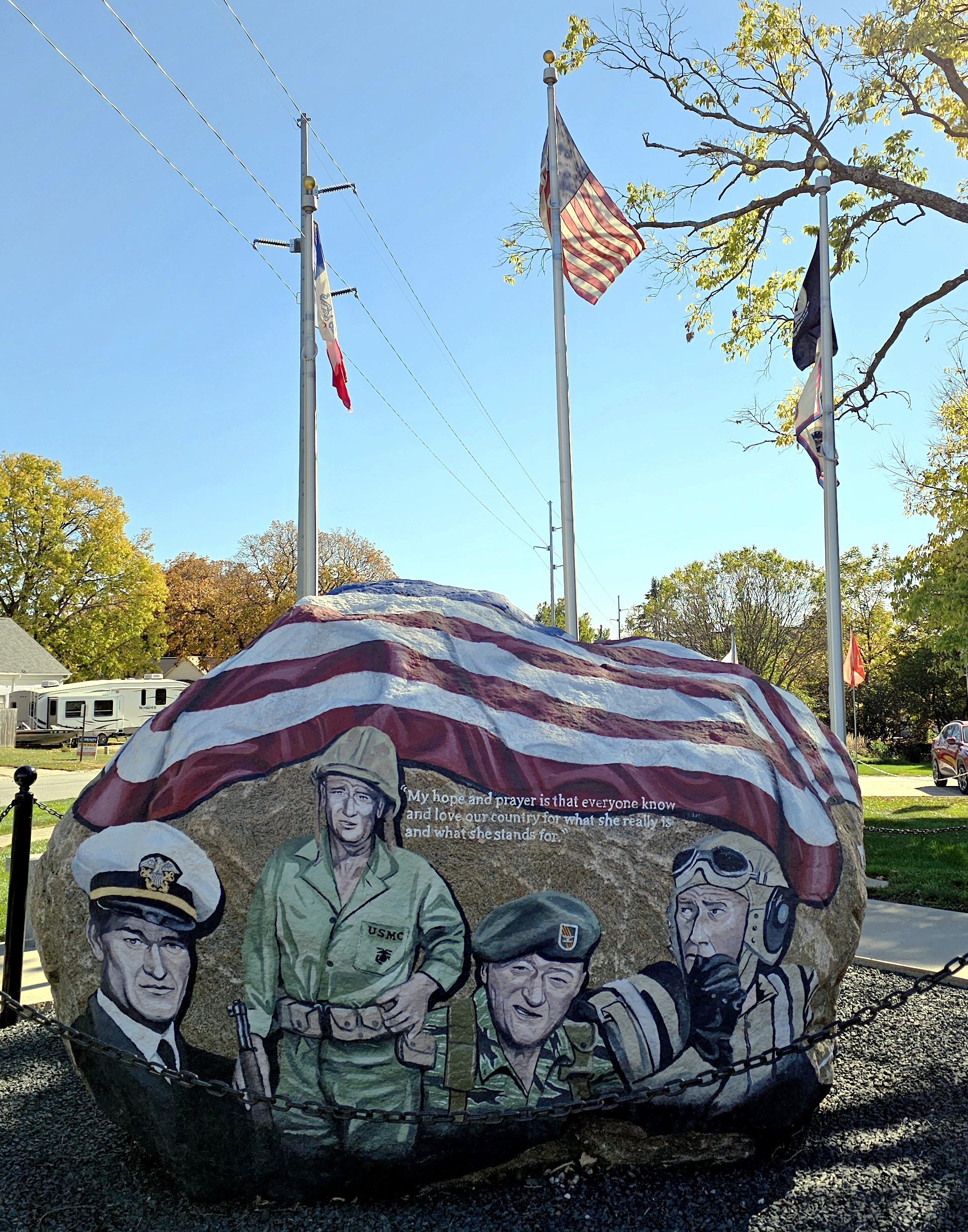 Outside of the museum was another cool thing I had never seen before. It is a Freedom Rock. There is one rock in each of the 99 counties of Iowa. The artist Ray “Bubba” Sorensen started painting Freedom Rocks to honor military veterans. The one in Winterset honors veterans, prisoners of war, John Wayne (even though he was not allowed to serve due to having 4 children), and Quilts of Valor. Quilts of Valor was started in Winterset. Volunteers create a quilt and present it to a veteran in honor of his service to our country. My father was fortunate enough to be honored with one of these beautiful quilts. The picture of Dad receiving is the quilt is courtesy of my brother, Chris.