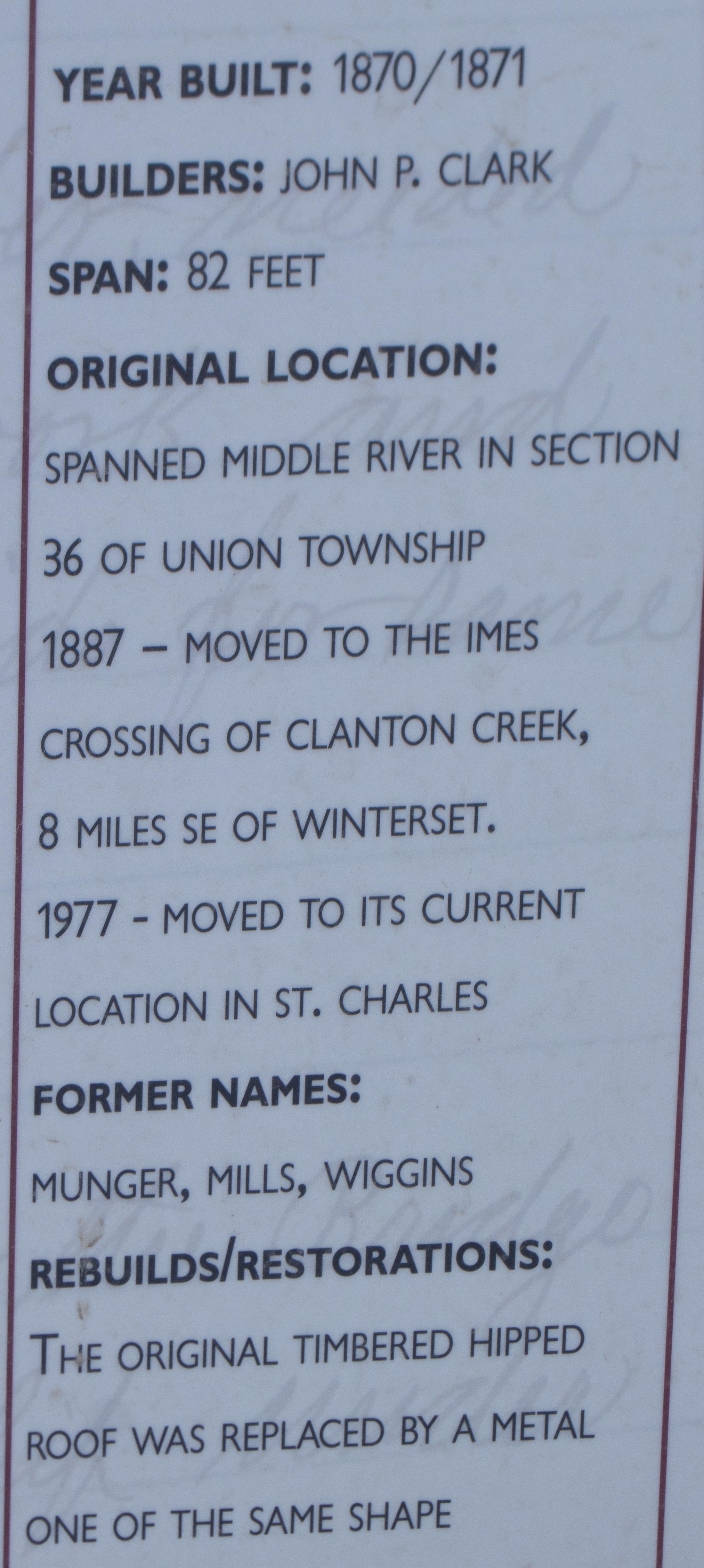 After our detours in Winterset, we continued on to see the last two bridges. The next bridge was a nice surprise. We could actually drive across it! It is the only one available to drive. Of course, we did drive it! This is the Cedar Covered Bridge. It also had a nice gazebo and picnic area. This bridge was rebuilt twice due to arson.
