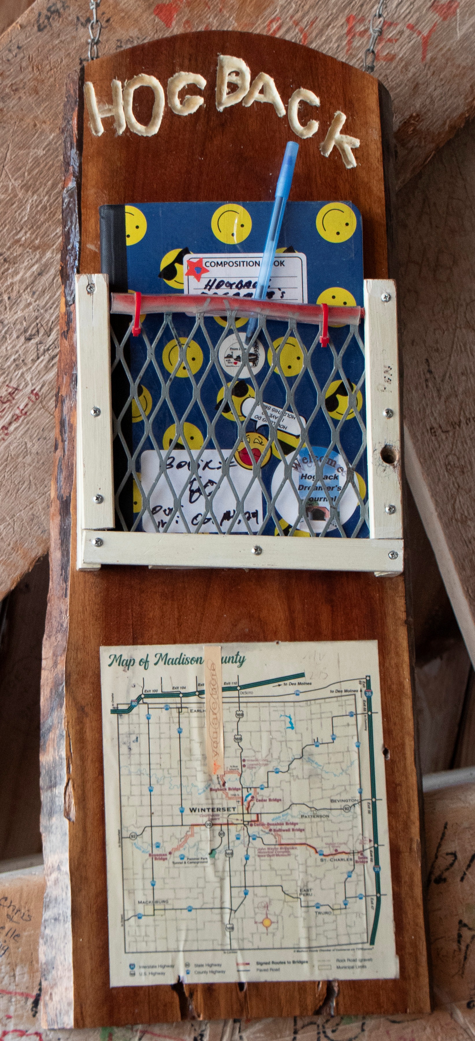 The last bridge and finale of our tour of Madison County was Hogback Bridge. This bridge was situated on some farmland and it made a beautiful setting. It also had a journal for people to sign, share feelings, and experiences.
